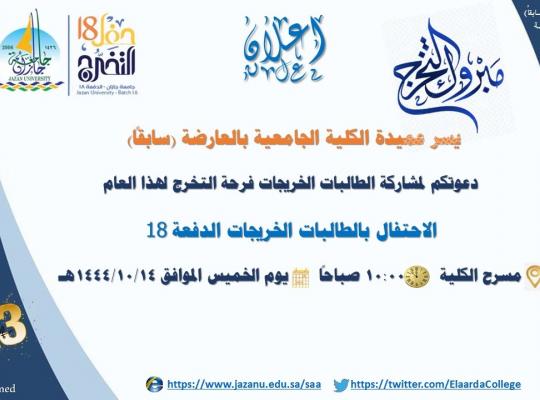 يسر عميدة الكلية الجامعية بالعارضة (سابقاً)دعوتكم لمشاركة الطالبات الخريجات فرحة التخرج لهذا العام