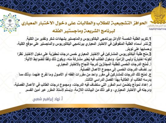 الحوافز التشجيعية للطلاب والطالبات على دخول الاختبار المعياري لبرنامج الشريعة وماجستير الفقه.
