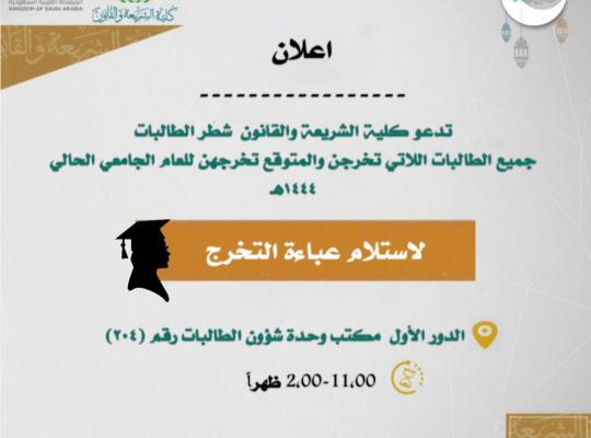 دعوة جميع الطالبات الاتي تخرجن والمتوقع تخرجهن للعام الجامعي الحالي 1444هـ لاستلام عباءة التخرج.