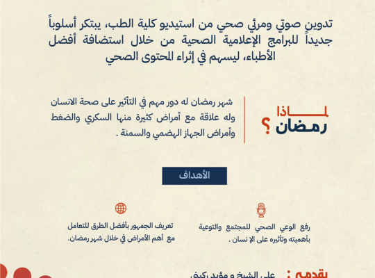 يعود لكم أستديو كلية الطب ببرنامج بودكاست رمضان وهو تدوين صوتي ومرئي صحي ، يبتكر أسلوب جديد للبرامج الإعلامية الصحية من خلال استضافة نخبة من الأطباء ، ليسهم في إثراء المحتوى الصحي. وكل عام وانتم بخير