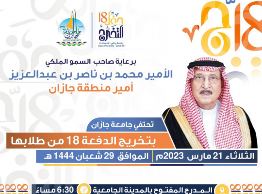 برعاية سمو أمير منطقة جازان تحتفي جامعة جازان بتخريج الدفعة الـ 18 من طلابها. مساء الثلاثاء: 29 شعبان 1444هـ الموافق 21 مارس 2023م عند الساعة 6:30 م بالمدرج المفتوح بالمدينة الجامعية.
