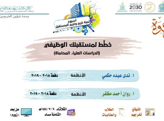 🌟 ضمن أسبوع "ثمرة خريج وخريج المستقبل" في كلية الشريعة والقانون ✉️ تدعوكم وكالة الكلية للشؤون الأكاديمية، ممثلة في وحدة شؤون الخريجين 🛋️ لحضور لقاء "خطط لمستقبلك الوظيفي" 📑 يشارك فيه: 🎙️ا. ندى عبده حكمي خريجة قسم الأنظمة ٢٠١٨-٢٠١٩ 🎙️ا. روان أحمد مظفر