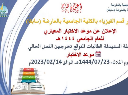 يسر قسم الفيزياء الإعلان عن موعد الاحتبارالمعياري للعام الجامعي 1444هـ