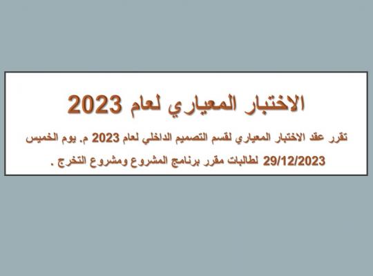 تقرر عقد الاختبار المعياري لقسم التصميم الداخلي لعام 2023 م. يوم الخميس 29/12/2023 لطالبات مقرر برنامج المشروع ومشروع التخرج .