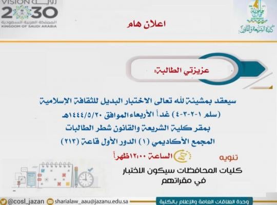 عزيزتي الطالبة سيعقد بمشيئة الله تعالى الاختبار البديل للثقافة الاسلامية