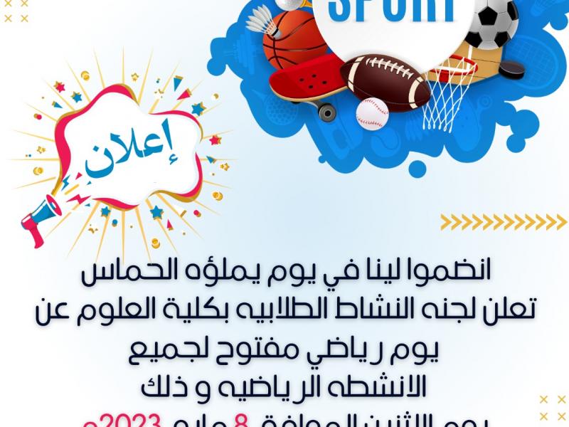 تعلن لجنة النشاط الطلابى بكلية العلوم عن يوم رياضي مفتوح لطالبات الكلية وذلك يوم الإثنين 8-5-2023م بمقر الصالة الرياضية بمجمع البنات بمحلية