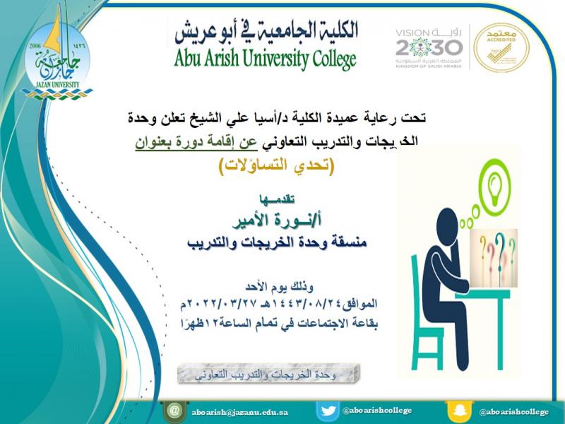 نظمت منسقة وحدة الخريجات والتدريب التعاوني أ. نورة علي الأمير فعالية بعنوان (تحدي التساؤلات)، وكانت الفعالية بحضور عميدة الكلية د.آسيا علي الشيخ ووكيلة الكلية للشؤون الأكاديمية أ/ هناء دغريري وبتنفيذ منسقة الوحدة استهدفت جميع طالبات الكلية المتوقع تخرجهم وذلك يوم الأحد الموافق 27مارس2022م والتي تسعى دائمًا لتحقيق التميز المهني والتدريبي لخريجات الكلية، هذا وقد ركزت الفعالية على: