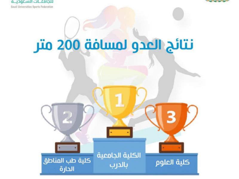 في مشاركتها الثانية بالموسم الرياضي الجامعي، حصدت الكلية الجامعية بالدرب المركز الأول في سباق العدو لمسافة ٢٠٠ م على مستوى كليات الجامعة، نبارك لطالبتنا المتميزة وعد أبو شقارة ونفخر بفريقنا الرياضي، ونتوجّه يالشكر لسعادة عميدة الكلية على دعمها المستمر لرعاية الأنشطة الطلابية، والفريق الرياضي بالكلية..