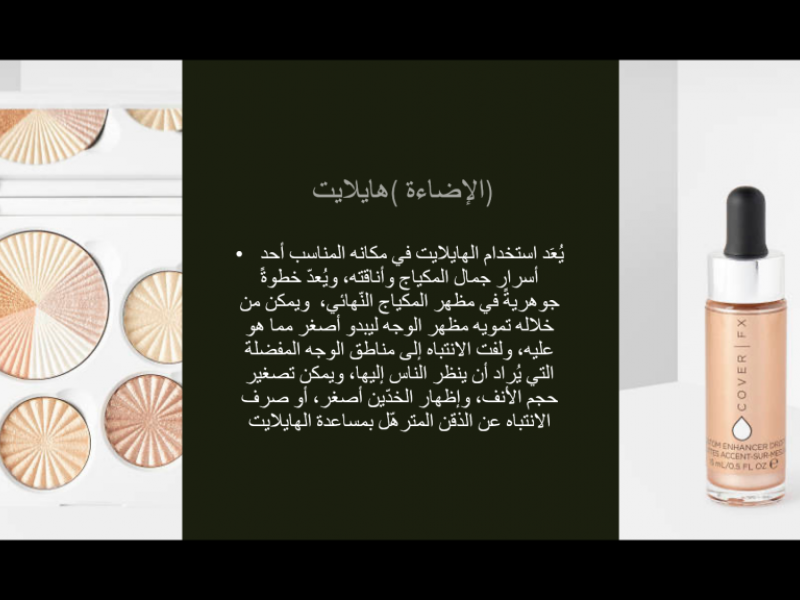 وقد اختتمت الفعالية بمقطع مصور يوضح طرق إبراز جمال المكياج .. وتم شكر الحضور على حسن الحضور والإستماع والمداخلات الجميلة التي أضفت طابع رائع على الدورة.