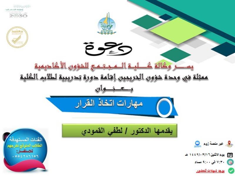 پسر وكالة كلية المجتمع للشؤون الأكاديمية ممثلة في وحدة شؤون الخريجين إقامة دورة تدريبية لطلاب الكلية بعنوان مهارات اتخاذ القرار يقدمها الدكتور / لطفي القمودي .يوجد شهادات الحشو .
