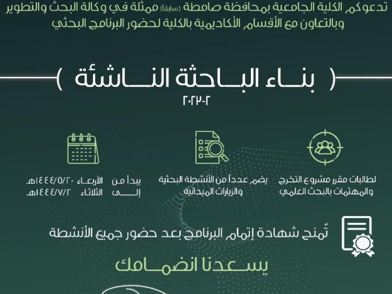 اختتمت وكالة البحث والتطوير في الكلية الجامعية بمحافظة صامطة (سابقاً) ممثلة في وحدة البحث العلمي بالتعاون مع الأقسام الأكاديمية بالكلية البرنامج البحثي "بناء الباحثة الناشئة" في دورته الثالثة. استهدف البرنامج الطالبات المسجلات في مقرر مشروع التخرج في الأقسام المختلفة وأيضاً جميع المهتمات بالبحث العلمي. كان الهدف من هذا البرنامج هو تهيئة الطالبات للدخول في المجال البحثي من خلال بناء المفاهيم الأساسية في البحث العلمي لديهن وإكسابهن المهارات البحثية اللازمة التي تساعدهن في اجتياز المقرر بكفاءة عالية وبالتالي بناء باحثة متمكنة. احتوى البرنامج البحثي على عدد من الورش التدريبية التي قدّمها نخبة متميزة من أعضاء هيئة التدريس بالكلية، وامتدت على مدار الفصل الدراسي الحالي. وأيضاً تم تنظيم زيارات علمية إلى المختبرات البحثية في الجامعة. تناول هذا البرنامج عدة محاور رئيسية في المجال البحثي شملت أهم مبادئ البحث العلمي ومناقشة أهميته في مختلف المجالات، والتعريف بالمكتبة الرقمية السعودية كمصدر من مصادر المعلومات والتي تعتبر ثراء معرفي ونبراس علم. كما تم مناقشة الاستراتيجيات التي تساعد الباحثة على قراءة الأوراق العلمية وتلخيص أهم المعلومات فيها، وكيف يمكن تصميم وكتابة البحث العلمي بمختلف منهجياته، وتصميم أدوات البحث مثل الاستبانات التي تعد من الأدوات البحثية الهامة. وركز هذا البرنامج أيضاً على تنمية المهارات البحثية التقنية لدى الطالبات مثل استخدام برنامج إكسل (Excel) لتمثيل البيانات وتحليلها إحصائياً، واستخدام برنامج مندلي (Mendely) لتوثيق مراجع البحث بطريقة علمية. وأيضاً التصميم الفني والعلمي لنتائج البحث على هيئة عرض تقديمي وملصق علمي، مع التركيز على مهارات التواصل مع الجمهور أثناء عرض النتائج ومهارات العرض المختلفة. وفي ختام هذا البرنامج تم استطلاع رأي الباحثات الناشئات وتقييمهن لهذا البرنامج بمختلف أنشطته، وكانت نسبة رضاهن عن البرنامج عالية وأوصى الجميع بالاستمرار بتقديم هذا البرنامج دورياً كنوع من التهيئة البحثية للطالبات.