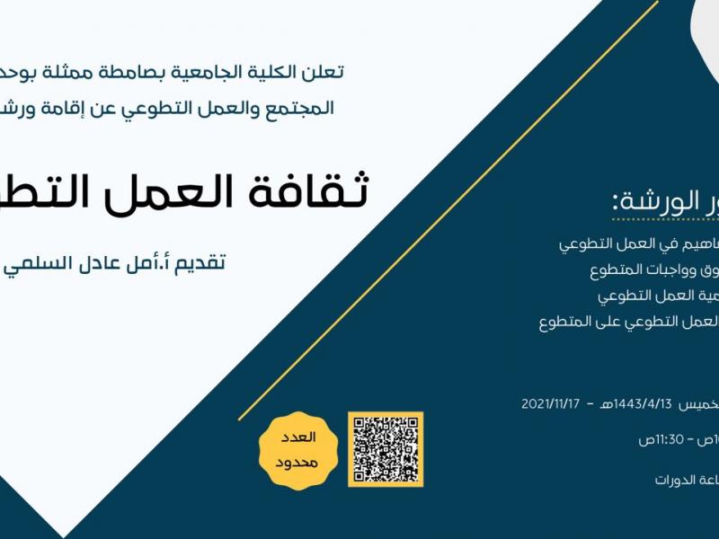 نفذت الكلية الجامعية بصامطة ممثلة في وحدة خدمة المجتمع والتعليم المستمر ورشة عمل بعنوان "ثقافة العمل التطوعي". قدمتها أ. أمل السلمي، وقد تطرقت الورشة لدور التطوع في تنمية المجتمعات، إضافة إلى أهمية العمل التطوعي لدى الأفراد والمكتسبات الإيجابية والخيرية التي قد يحصدها الفرد نتيجة قيامه بالأعمال التطوعية ومردودها على المجتمع من حوله. كما تناولت التعريف بحقوق وواجبات المتطوع، والخيارات المتاحة لكل متطوع من أجل ممارسة العمل التطوعي. وقد حضيت الورشة بمداخلات ومشاركات طالبات الكلية البناءة وعرض تجاربهن في العمل التطوعي.