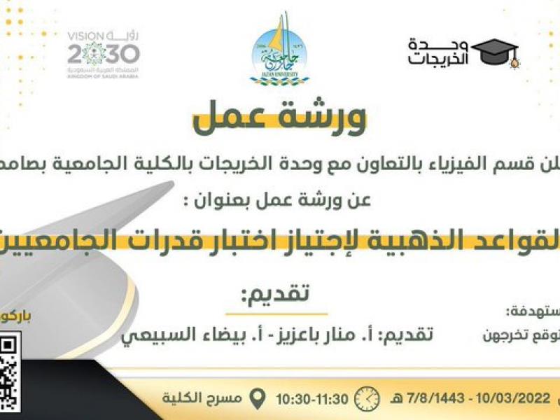 نظمت الكلية الجامعة بصامطة ممثلة في وحدة الخريجات ورشة عمل بعنوان "القواعد الذهبية لاجتياز قدرات الجامعيين" نفذتها الأستاذة بيضاء السبيعي و الأستاذة منار باعزيز مستهدفة الطالبات المتوقع تخرجهن. وتطرقت الورشة لعدة محاور أبرزها توضيح المحاور الأساسية وأهمية القدرات الجامعية للطالبات لإكمال الدراسات العليا والتقديم للوظائف الأكاديمية والفرق بين القدرات الجامعية والقدرات العامة وتوضيح أقسام اختبار القدرات ما بين لفظي وكمي و الإشكال والمنطق يشار إلى أن اللقاء كان تدريبياً تفاعلياً تم فيه مناقشة استفسارات المتدربات التي أَثْرَت اللقاء. واختتمت الورشة ببعض التوصيات لتعزيز مهارات الطالبات.