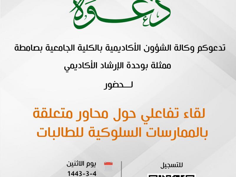 نظمت الكلية الجامعة بصامطة ممثلةً بوحدة الإرشاد الأكاديمي (لقاء تفاعلي حول محاور متعلقة بالممارسات السلوكية للطالبات). وأدار اللقاء منسقة وحدة الإرشاد الأكاديمي بالكلية أ. أميرة حكمي. استهدفت في هذا اللقاء الكادر الإداري ومراقبات الأمن بالكلية. عرض في هذا اللقاء الأخلاقيات التي ينبغي أن تتحلى بها الطالبة في الكلية أثناء سير العملية التعليمية، وتم مناقشة بعض الممارسات والسلوكيات الخاطئة التى تصدر من بعض الطالبات.