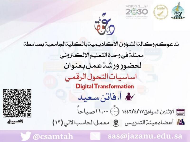 نفذت الكلية الجامعية بصامطة ممثلةً في وحدة التعليم الإلكتروني ورشة عمل بعنوان "أساسيات التحول الرقمي". نفذتها أ.فاتن سعيد واستهدفت فيها أعضاء هيئة التدريس. والتحول الرقمي له دوره في تطور الحياة الإنسانية والتغيير الإجتماعي لحياة الأفراد وغرس كثير من الأفكار الجديدة لديهم. وتناولت الورشة عدة محاور من أبرزها ماهية التحول الرقمي وعلاقتة برؤية المملكة العربية السعودية ٢٠٣٠، ثم تناولت خصائص التحول الرقمي وأهم خطواته، تلى ذلك فوائد التحول الرقمي منها تقديم خدمات مبتكرة وإبداعية. وقد بينت أهم المحاور التي تسعى إليها المملكة للوصول إلى وطن رقمي وهي بناء القدرات، استثمار المشاريع، إصلاح التنظيمات التي تتلاءم مع العصر الرقمي. ثم تحدثت عن الاستراتيجية الوطنية والبنية التحتية الرقمية والتي تصدرت فيها المملكة قائمة الدول الرائدة في مجال الاقتصاد الرقمي. وكذلك تطرقت لواقع التحول الرقمي وأهم التقنيات الناشئة واهميتها في التعليم الذي يعتمد على التقنية (أجهزة وبرامج) ويرتكز على جانبي تقليل التكاليف ورفع جودة العمل. ثم أوضحت أثره في مناهج التدريس والتعلم، ثم بينت مزايا التحول الرقمي ومصادر المعرفة الرقمية في مجال التعليم.