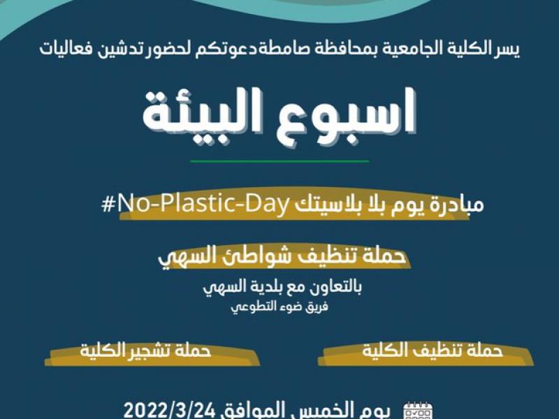 من منطلق ايماننا بدور الفرد المحوري في المحافظة على نماء البيئة وإستدامتها نفذت الكلية الجامعية بمحافظة صامطة و تحت شعار "بيئتنا_مسؤوليتنا" برنامجا لتفعيل أسبوع البيئة ٢٠٢٢. تضمن البرنامج عدد من الحملات والمبادرات والتي حرصت فيها الكلية على إشراك طالباتها ومنسوباتها في جميع المبادرات وذلك تأكيداً على دورهن الحيوي في المحافظة على البيئة. كان في أولى هذه المبادرات مبادرة يوم بلا بلاستيك والتي جاءت مشجعة للسلوكيات والممارسات الصديقة للبيئة ومؤكدة على أن الفرد عنصرا مهما في الحفاظ على البيئة ومواردها. كما تم تفعيل حملة تشجير الكلية بالتعاون مع إدراة التشجير والري بجامعة جازان والتي لاقت تفاعلا رائعاً من طالبات الكلية ومنسوباتها. تم أيضاً تفعيل حملة تنظيف الكلية وحملة تنظيف شاطئ السهي بالتعاون مع بلدية السهي كلا على حده حيث جاءت هاتان الحملتان معززتان لدور الفرد الحيوي ومؤكدتان على رفع مستوى الوعي لدى الفرد بواجبه ومسئوليته تجاه بيئته والمحافظة على نمائها واستدامتها. ومن الجدير بالذكر أن هذة المبادرات لاقت إقبالا كبيرا وتفاعلاً رائعاً من طالبات الكلية ومنسوباتها.