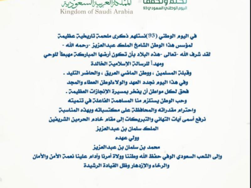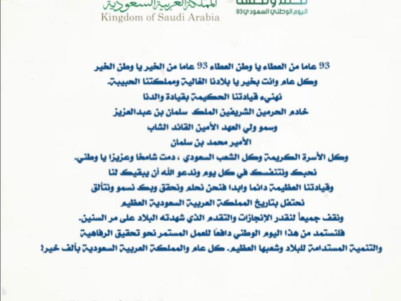 تسعة عقود من العز والفخر في #اليوم_الوطني_السعودي_93 يرفع *فضيلة عميد الكلية، د. علي صميلي*، التهنئة إلى مقام خادم الحرمين الشريفين، وسمو ولي عهده الأمين، حفظهما الله.
