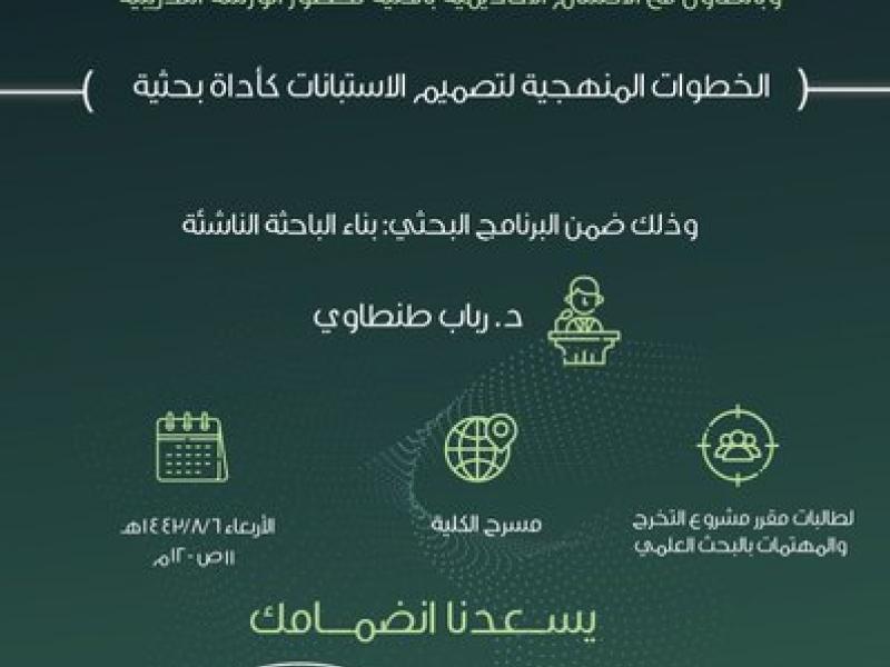 نفذت الكلية الجامعية بصامطة ممثلة في وكالة البحث والتطوير بالتعاون مع الأقسام الأكاديمية الجامعية بالجامعة ورشة تدريبية بعنوان الخطوات المنهجية لتعميم الاستبيان كأداة بحثية وذلك ضمن البرنامج البحثي بناء الباحثة الناشئة نفذتها د. رباب طنطاوي مستهدفة طالبات التخرج والبحث العلمي، أوضحت الدكتورة رباب في الورشة الهدف الرئيسي للنشاط كما تم إيضاح الخطوات المنهجية لتصميم الاستبانات كأداة بحثية والهدف الرئيسي للنشاط وتوضيح محاور النشاط ومنها: مفهوم الاستبيان، ومواصفات الاستبيان الجيد، والخطوات المنهجية لتصميم الاستبيان. وأنواع الاستبيان، ومراحل إعداده، وكيفية تلافي الأخطاء في تصميم الاستبيان، ومميزات وعيوب الاستبيان، وتصميم الاستبيان الالكتروني ومميزاته وعيوبه، واختتمت الورشة بتمكين المشاركات في أن تصمم الاستبيان وفق الخطوات المنهجية وإنشائه الكترونياً