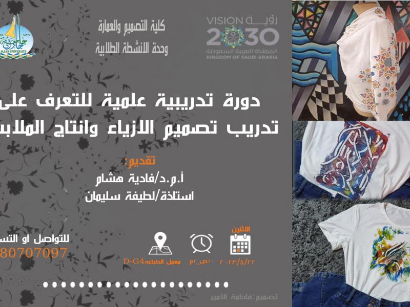 بتوجيه من سعادة عميدة كلية التصميم والعمارة أ. د / فاطمة الشيخ، نفذت وحدة النشاط الطلابي دورة تدريبية عملية للتعرف على تدريب تصميم الأزياء والملابس بمعمل الطباعة ((DG- 4 وذلك يوم الاثنين الموافق 22/5/2023 م. وقدم الدورة أ. م. د / فادية هشام، واستاذة لطيفة سليمان مناجي.