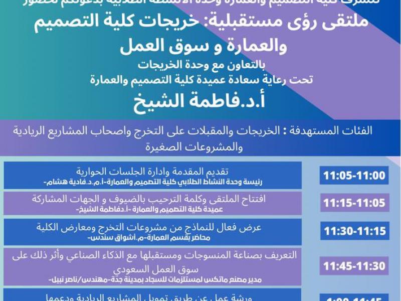 اطلقت كلية التصميم والعمارة ممثلة في وحدة الأنشطة الطلابية  ملتقي " رؤى مستقبلية لخرجات كلية التصميم والعمارة "  برعاية سعادة وعميدة كلية التصميم والعمارة  أ.د / فاطمة الشيخ  واستضافت الكلية   من الجهات المهنية وسوق العمل (شركة ماتكس لمستلزمات السجاد مدينة جدة) ويمثلها مدير مصنع ماتكس المهندس ناصر نبيل  وقدم ورشة عمل بعنوان " التعريف بصناعة المنسوجات ومستقبل الصناعات النسيجية والذكاء الاصطناعي  وآثر ذلك علي سوق العمل السعودي " ، ومن الجهات الممولة للمشاريع  بنك التنمية  الاجتماعية بجازان ويمثلها أخصائية تمويل المشاريع الأستاذة بشرى الشرواني وقدمت دورة تدريبية بعنوان " طرق التمويل للمشاريع الريادية ودعمها " ، وشاركت كلية التصميم أستاذ هندسة التصميمات الصناعية والمعادن واللدائن بورشة عمل عن " آلية تسجيل براءات الاختراع " قدمها الدكتور عبد الرحمن أبو زيد  والمحاضر بقسم العمارة  الأستاذة  أشواق سندس قدمت عرض لمشاريع خريجات كلية التصميم والعمارة ومعارض الكلية  ، وأدارت الجلسات الحوارية وقدمت الملتقى د / فادية هشام.  وبدات  فقرات الملتقي بالترحيب بالضيوف والحضور وعرض  فعاليات و اهداف الملتقي  التي تستهدف  دعم التبادل العلمي والتقني وتوطيد العلاقات الخارجية بالجهات المهنية وجهات التدريب وتبادل الخبرات  والاستشارات العلمية مع  الجهات المهنية والصناعة ورجال الأعمال  ، ومواكبة الاتجاهات العالمية في التصميم والسوق المحلي والعالمي ، ومواكبة تطوير العلوم الإنسانية والصناعة في ظل عصر الرقمنة والذكاء الاصطناعي للتمكين من توظيف الخريجات وتأهيلهم لقيادة القاطرة ، والذى يناسب مع رؤية التعليم والتوجهات العالمية بما يواكب رؤية المملكة العربية السعودية 2030 والجهات المشاركة . وتم تقديم الجلسات الحوارية للجهات المشاركة لجميع ورش العمل والمشاركون ومع نهاية كل جلسة تم مناقشة جميع الاستفسارات والمقترحات لكل ما هو متعلق بدراسة علاقة الخريجات بسوق العمل وطرق تمويل المشاريع وآلية تسجيل براءات الاختراع وعروض فعالية وفيديوهات توضيحية للخريجات والحضور الذي أثري فعاليات الملتقي وعزز دوره واهميته لدى خريجات الكلية وأصحاب المشاريع الحرة والريادية