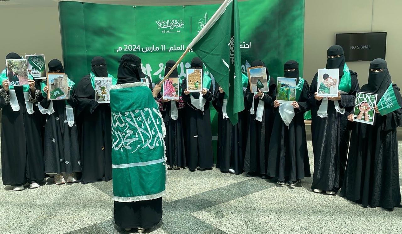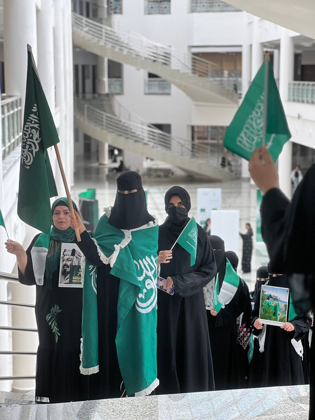 نظمت كلية التصميم والعمارة ممثلة في وحدة الأنشطة الطلابية " مسيرة وطنية احتفاءبيوم العلم السعودى " بمجمع الطالبات بمحلية وقد سطر طالبات ومنسوبي الكلية المسيرة حاملين سارية العلم السعودى وأعمال فنية إبداعية تعكس اهمية يوم العلم السعودى وتجسد رموزه ومفهوم الوحدة والقوة والإنتماء لهذا الوطن العظيم في قلوب المواطنين والمقييمين علي ارضها ، وتحركت المسيرة مع النشيد الوطني باجواء تسودها الهمة وطاقة اللون الأخضر تنتشر بارجاء مجمع محلية للطالبات مجسدين تاريخ الدولة وهويتها وبطولاتها والعزة والشموخ للدولة السعودية ورموز العلم كل معاني النماء والرخاء وهوية الدولة السعودية وتاريخها وعصور الرخاء التي مرت بها الدولة السعودية منذ عهد " الإمام محمد بن سعود – رحمه الله – عام 1727، وحتي عهد خادم الحرمين الشريفين الملك سلمان بن عبد العزيز ، وسمو ولي عهده الأمين "