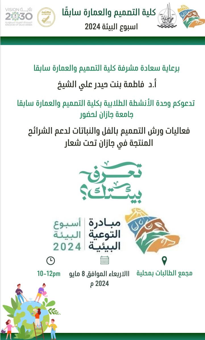 اطلقت كلية التصميم والعمارة سابقاً ممثلة في وحدة النشطة الطلابية فعاليات اسبوع البيئة 2024م " فعاليتها ورش التصميم بالفل والنباتات لدعم الشرائح المنتجة في جازان" برعاية سعادةمشرفة كلية التصميم والعمارة سابقا أ .د / فاطمة ينت حيدر علي الشيخ ، ودشن الإفتتاح رئيسة وحدة الأنشطة الطلابية ومشرفة المبادرة أ . م . د / فادية هشام من خلال برامجتوعوية عن تعريف بثروات البيئة الجازنية من النباتات العطرية والفل واهميتها وزراعتها والمحافظة عليها ومستقبل مدينة جازان الإقتصادى المتوقع إقامة اكبر (مدينة استثمارية للفل بجازان ) غرفة جازان ، وصاحب البرنامج ورشة تصميم ملصقات ارشادية بها تحت شعار( تعرف بيئتك) ، كما قدمت المبادرة مجموعة ورش للتصميم بالفل والنباتات وتنسيق الزهور لدعم الشرائح المنتجة بجازان مع عرض مصاحب للورش- لاهم االصناعات التحولية المستخرجة من الفل الجازاني و النباتات العطرية وتاريخها بمنطقة جازان وصناعة مايعرف بزينة العروسة بالمنطقة قدمتها الطالبة : غدير محمد عبد الله حمدى ، والخريجة : أماني أحمد يحي حوباني .
