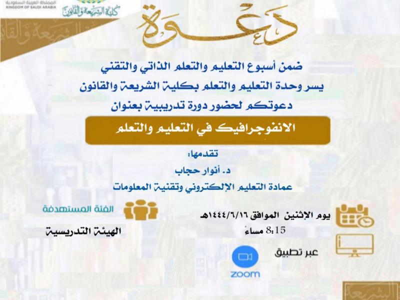 عناية بالدور التقني في الارتقاء بالتعليم والتعلم، نظمت وكالة كلية الشريعة والقانون للبحث والتطوير، ممثلة في وحدة التعليم والتعلم، دورة تقنية بعنوان: "الانفوجرافيك في التعليم والتعلم" وذلك يوم الاثنين ١٦/ ٦/ ١٤٤٤ في الساعة الثامنة مساءً عن بعد (زووم). وذلك بالتعاون مع عمادة التعليم الإلكتروني وتقنية المعلومات.