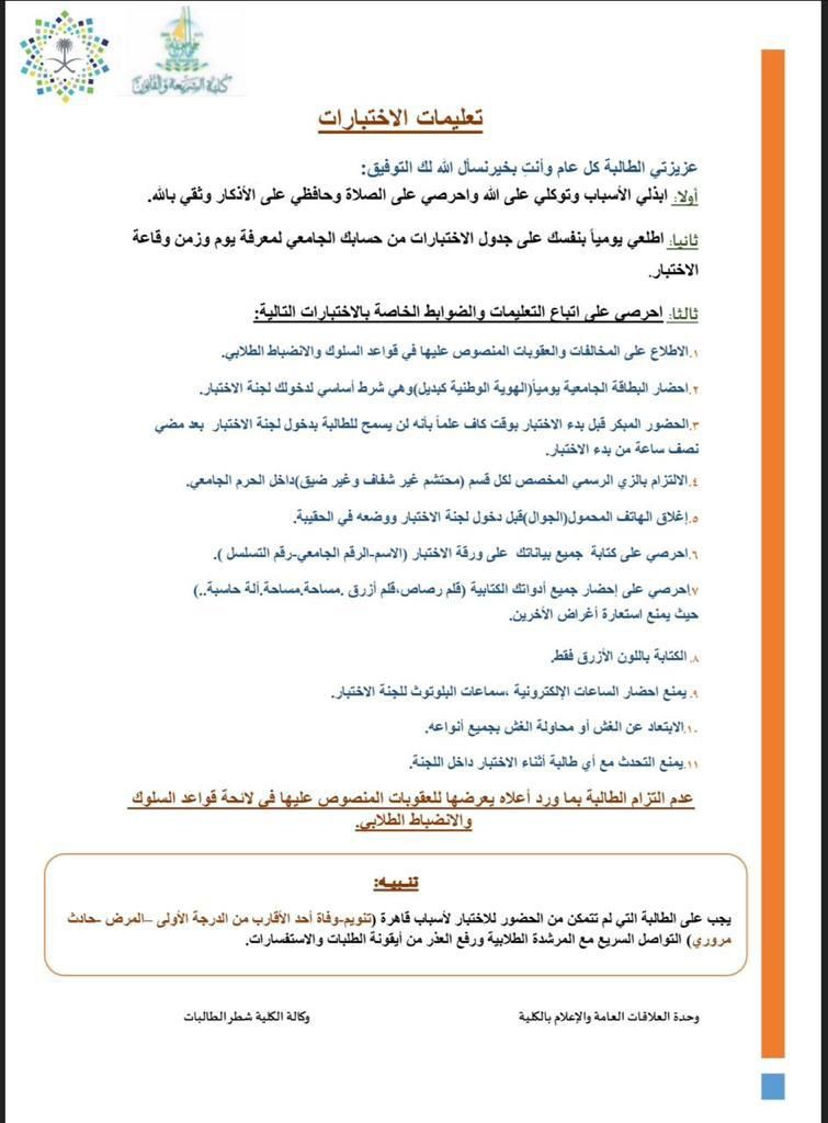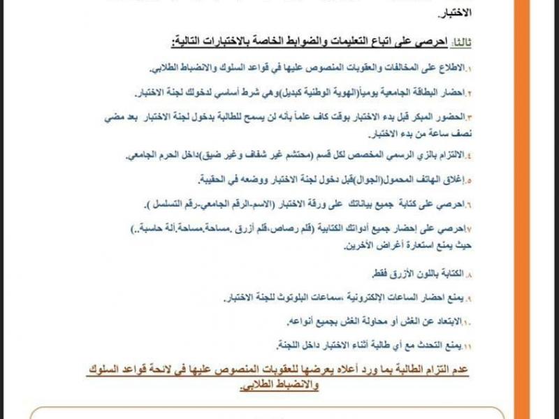 للتأكيد على التزام الطالبات بالتواجد في القاعات التي تقام بها الاختبارات بالوقت المناسب ، وتطبيق كافة التعليمات والإرشادات الخاصة بالاختبارات   وإحاطة الطالبات بها ، كما أكدت فضيلتها  على ضرورة توفير كافة السبل والمستلزمات بما ينعكس إيجاباً على أداء الطالبات أثناء تأديتهن لامتحاناتهن بكل يسر وسهولة .