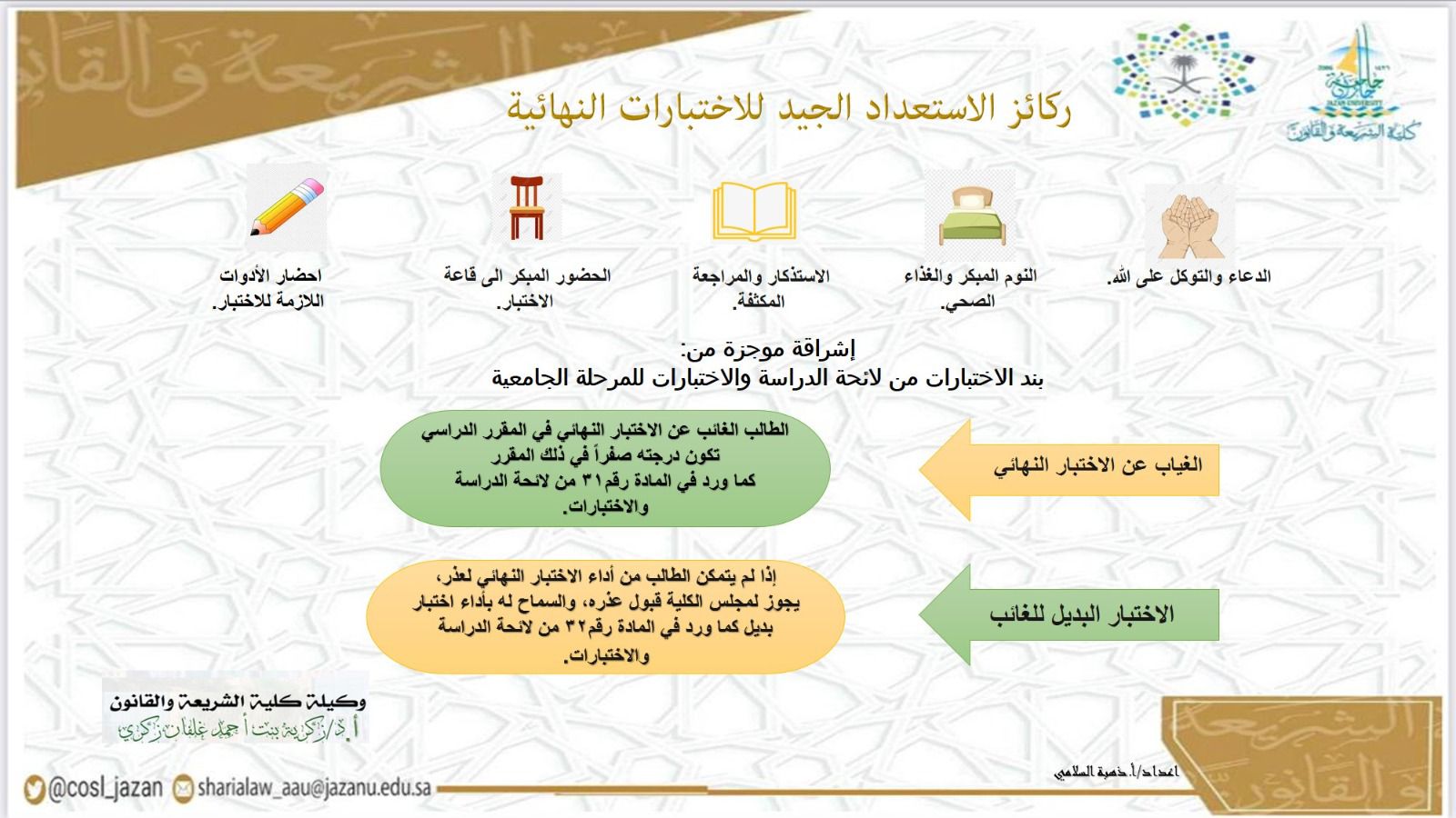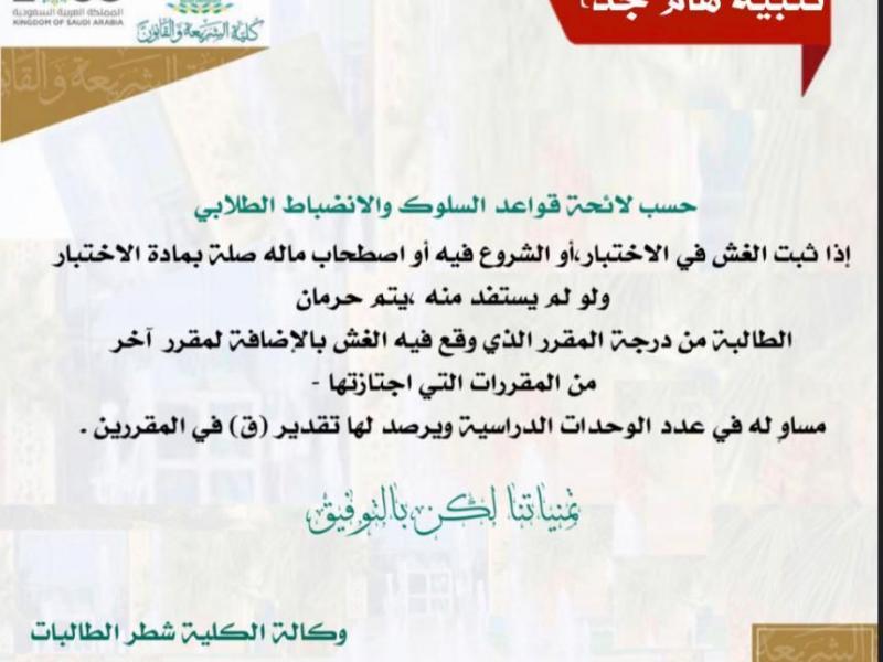 مع بداية الاختبارات النهائية للفصل الدراسي الأول تتمنى كلية الشريعة والقانون لجميع الطالبات التوفيق والنجاح والتفوق