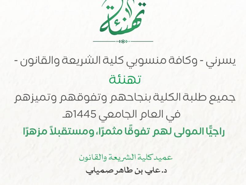 يسر عميد ومنسوبي كلية الشريعة والقانون تهنئة جميع طلبة الكلية بنجاحهم وتفوقهم وتميزهم في العام الجامعي ١٤٤٥هـ