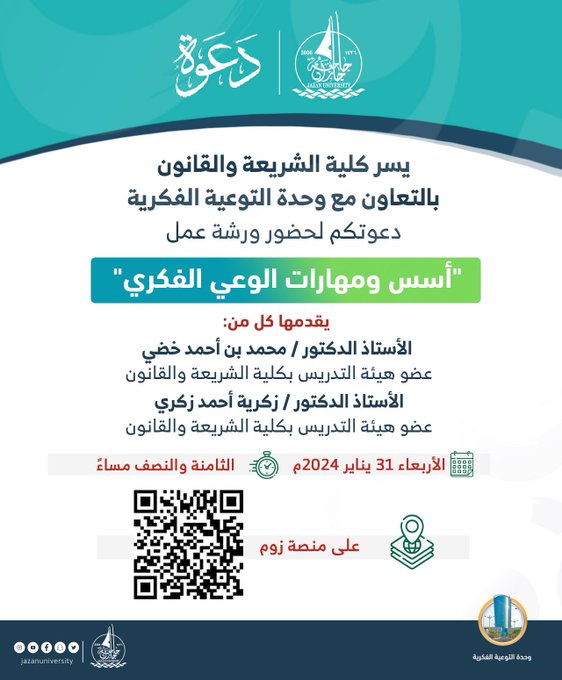 نفذت كلية الشريعة والقانون بالتعاون مع وحدة التوعية الفكرية ورشة عمل بعنوان ( أسس ومهارات الوعي الفكري ) يقدمها كل من : الاستاذ الدكتور / محمد بن أحمد خضي عضو هيئة التدريس بكلية الشريعة والقانون