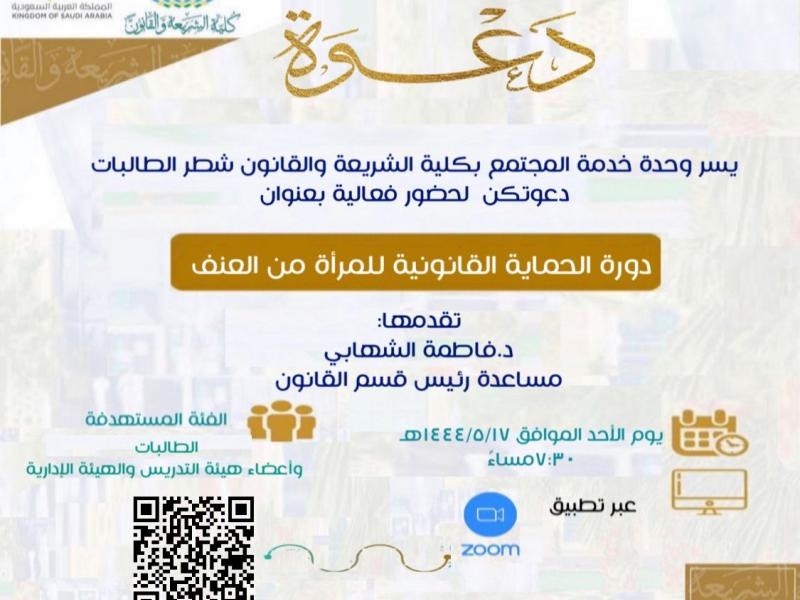 دورة بعنوان "دورة الحماية القانونية للمرأة من العنف" قدمتها مساعدة رئيس قسم القانون بالكلية سعادة الدكتورة فاطمة بنت محمد الشهابي والتي تهدف من خلالها إلى تعزيز الثقافة المجتمعية الرافضة لكافة أشكال العنف ضد المرأة، وحمايتها من خلال التوعية