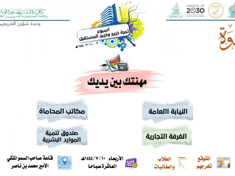 اختتمت يوم الأربعاء ١٠/ ٧/ ١٤٤٤، فعاليات أسبوع ثمرة خريج وخريج المستقبل، في كلية الشريعة والقانون، الذي تنظمه وكالة الكلية للشؤون الأكاديمية، ممثلة في وحدة شؤون الخريجين.