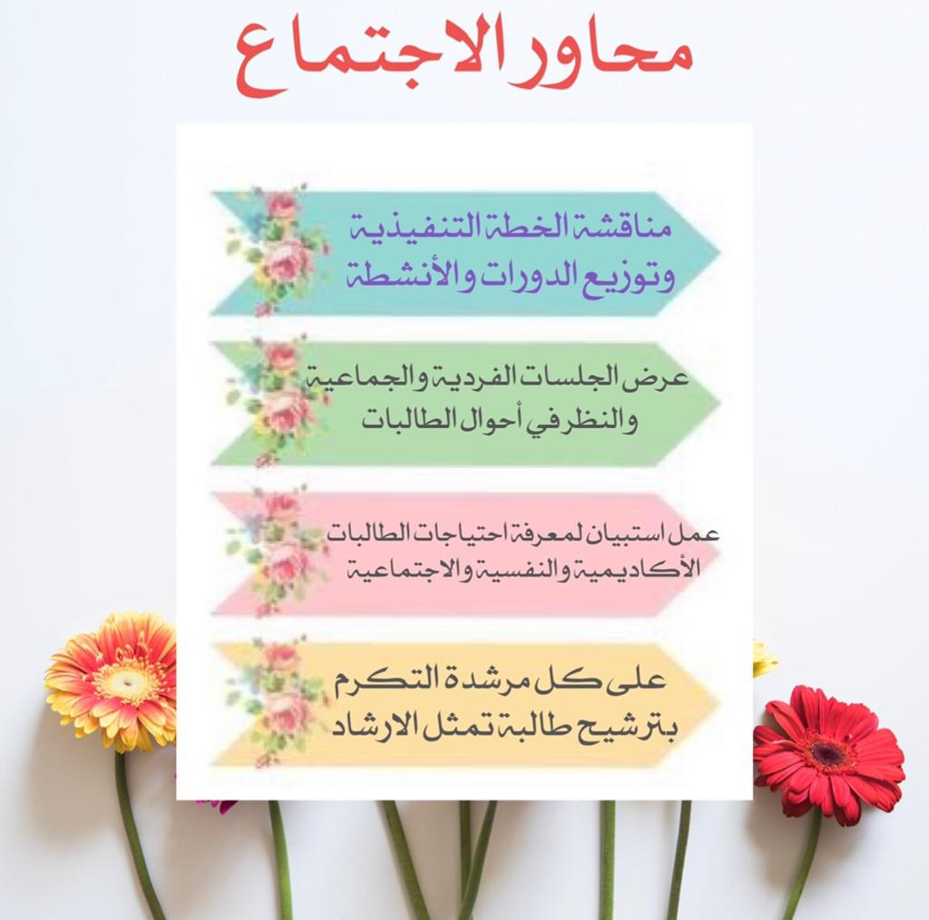 وعرض الجلسات الفردية والجماعية والنظر في أحوال الطالبات ومعالجة ما يستلزم علاجه