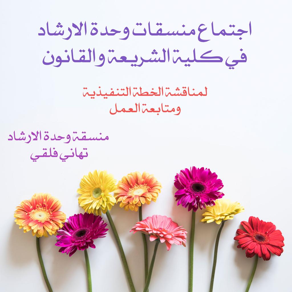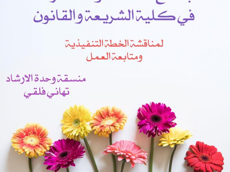 نفذت منسقة وحدة الإرشاد الطلابي المحاضرة تهاني فلقي عضو هيئة التدريس بكلية الشريعة والقانون شطر الطالبات الاجتماع الدوري الأول