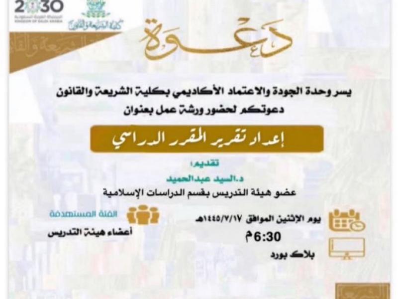 دورة تدريبية لإعداد تقرير المقرر بتقديم الدكتور السيد عبد الحميد ضمن خطة وحدة الجودة والاعتماد الأكاديمي الاثنين الساعة السادسة والنصف مساء على البلاك بورد ..