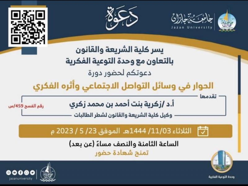 ضمن برنامج وحدة التوعية الفكرية نفذت وكيلة كلية الشريعة والقانون شطر الطالبات أ.د زكرية بنت أحمد غلفان زكري دورة بعنوان الحوار في وسائل التواصل وأثره الفكري تناولت فيها مفهوم الحوار الرقمي وأهميته وأهدافه وعن المزايا والفوائد التي يقدمها عبر شبكات التواصل الاجتماعي المتعددة، كما تطرقت لأسس الحوار الفعال وآدابه وأسرار الحوار الناجح الذي يتحدد بحسن إدارة العملية التحاورية، بداءً من طريقة الحوار مروراً بالأخلاقيات ختاماً بالرضا والإفادة، وتوضيح مقومات المحاور المحترف من خلال التنمية المعرفية والفكرية التي تظهر في الحوار والقواعد التنظيمية للحوار الجيد وفنون الإقناع بالحوار ومدى تأثيره في مجتمعنا الذي قد يكون في أمس الحاجة إلى فتح قنوات الحوار مع مختلف الفعاليات فيها.