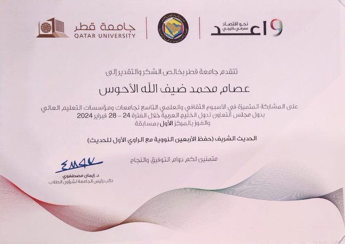 يسر رئيس قسم الدراسات الإسلامية أصالة عن نفسه ونيابة عن أعضاء وعضوات القسم أن يتقدموا بالتهنئة القلبية لمعالي رئيس الجامعة ووكلائه وعميد #كلية_الشريعة_والقانون وعميد شؤون الطلاب بمناسبة فوز الطالب (بالماجستير ) في كلية الشريعة/ عصام بن محمد الأحوسبالمركز الأول في مسابقة السنة النبوية في الأسبوع الثقافي والعلمي التاسع لجامعات ومؤسسات التعليم العالي بدول مجلس التعاون لدول الخليج العربي ..