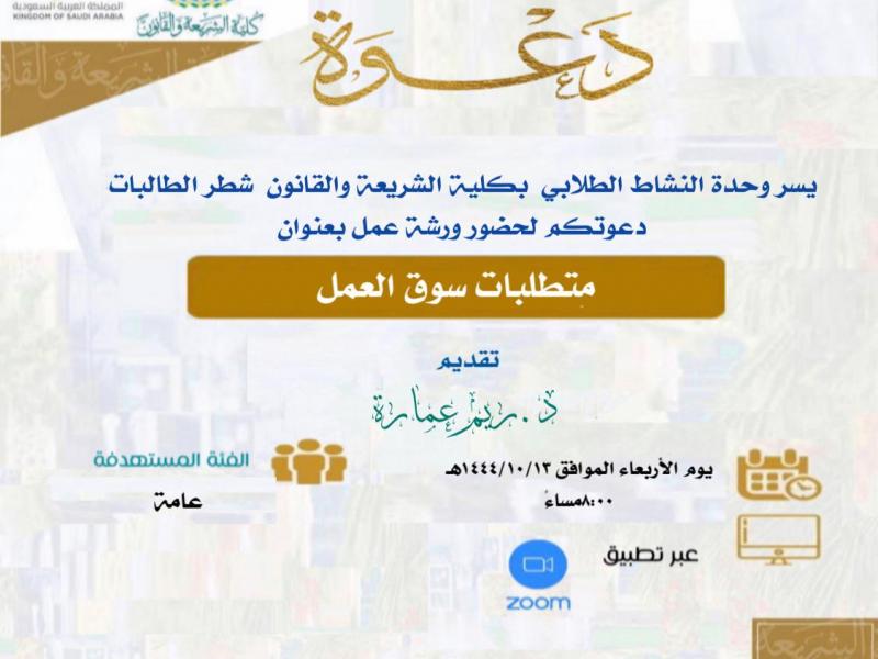 ضمن خطة وحدة النشاط الطلابي بكلية الشريعة والقانون شطر الطالبات نفذت عضو هيئة التدريس بقسم القانون ورشة عمل بعنوان متطلبات سوق العمل تناولت فيها أهم متطلبات سوق العمل السعودي  وملامحه و توجهاته
