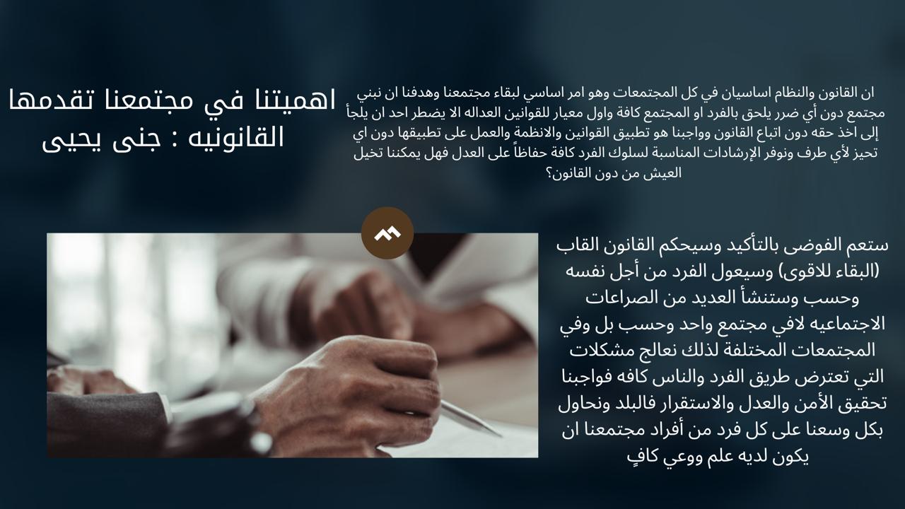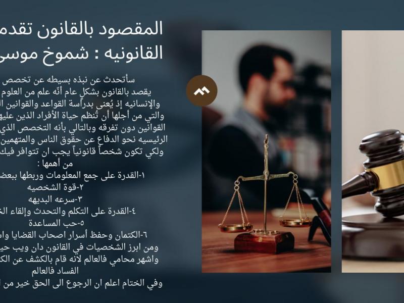 وتبعها المقصود بالقانون للطالبة شموخ موسى والتي تحدثت فيه بنبذه بسيطة عن تخصص القانون الذي تناولت فيه الحديث عن ماهية القانون وعن ماذا تتمحور غايته والخصال المهم توفرها في الشخص القانوني وبعضاً من أبرز الشخصيات في القانون.