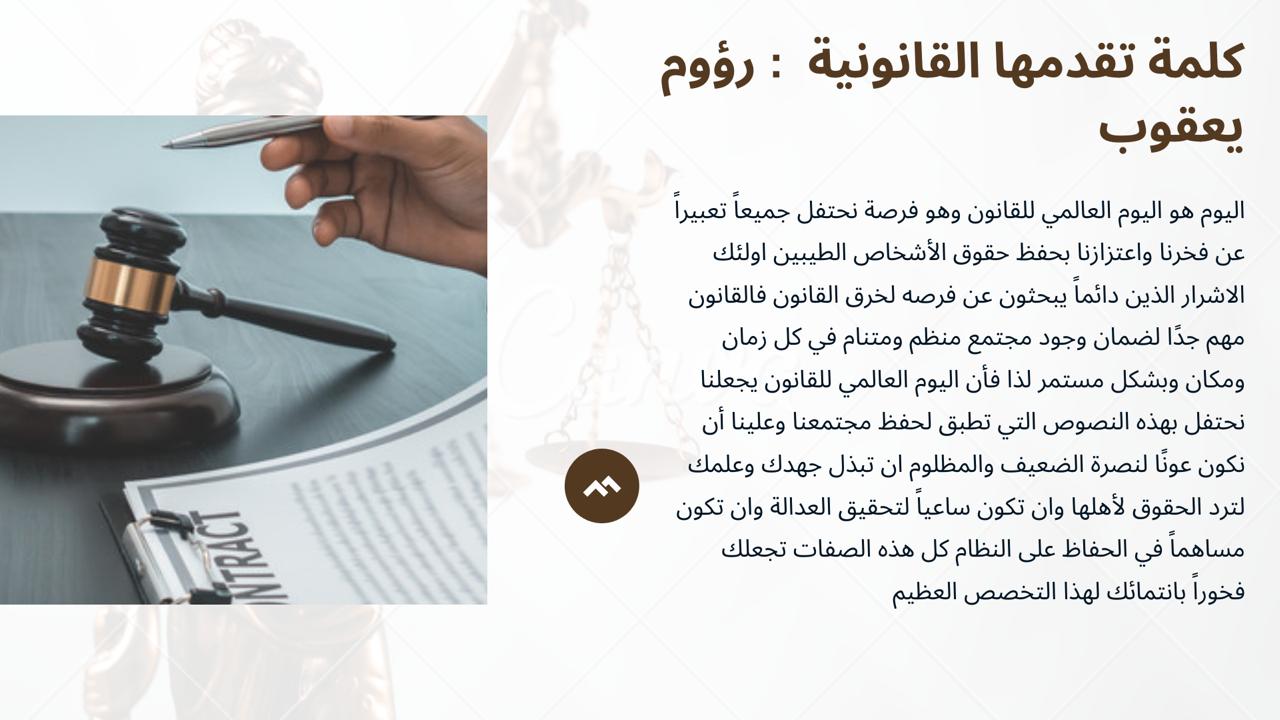 ومن ثم عقبتها كلمة للطالبة رؤوم يعقوب عن القانون تبث على الفخر والاعتزاز على لسانها بقول كوننا أشخاص نتخذ القانون وسيلة وذريعة لحفظ حقوق الأشخاص من حولنا.