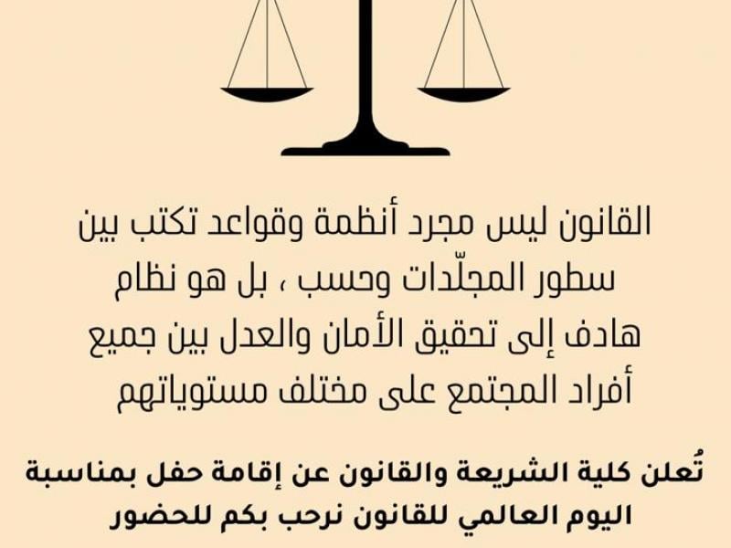 بمبادرة من الطالبات المستجدات في قسم القانون تم تفعيل لليوم العالمي للقانون لـ 13 من سبتمبر بحضور كل من وكيلة الكلية ومساعدة رئيس القسم وعدد من أعضاء هيئة التدريس والهيئة الإدارية.