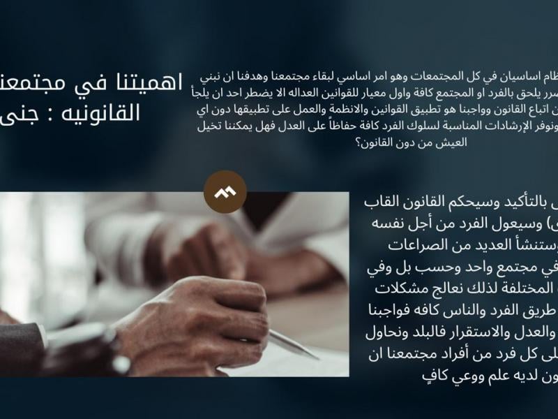 ثم تلاه عرض مرئي من تقديم الطالبة رهف حيدر تحدثت فيه عن أن القانون هو أساس الوجود لكي تستمر الحياة بشكل جيد وأن شراسة القانون ورحمته مرتبطة بأفعال الفرد.