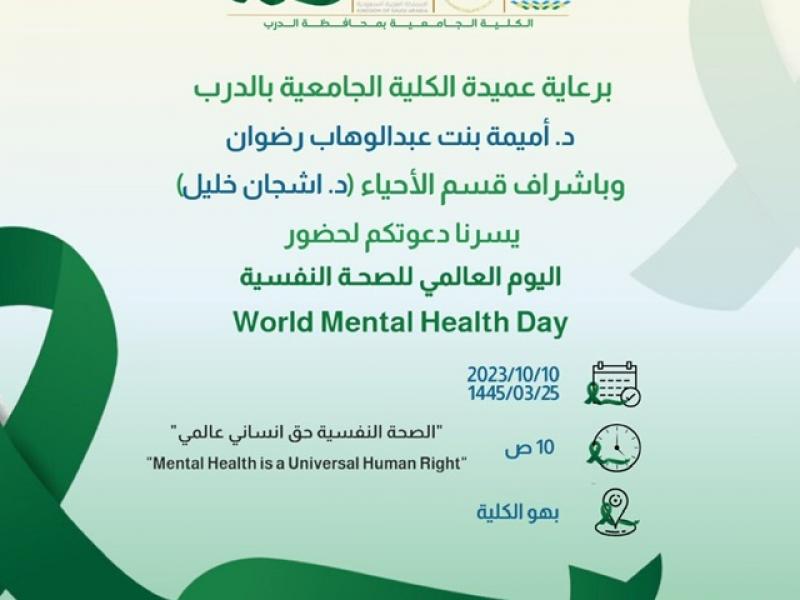 أقامت الكلية الجامعية بالدرب فعالية اليوم العالمي للصحة النفسية يوم الثلاثاء الموافق 1445/03/25هـ