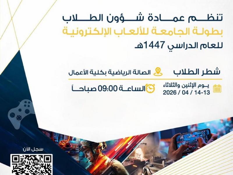 تُعلن عمادة شؤون الطلاب بـ #جامعة_جازان عن إقامة بطولة الجامعة للألعاب الإلكترونية للعام الدراسي 1447هـ