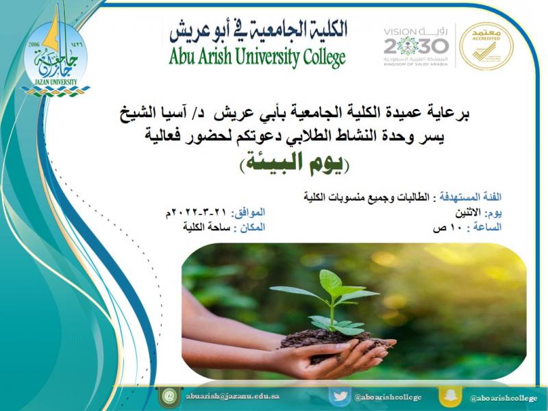 برعاية سعادة عميدة الكلية الجامعية بأبي عريش د.آسيا علي الشيخ فعلت وحدة النشاط الطلابي (يوم البيئة) يوم الاثنين الموافق 21-3-2022م بتشجير شتلات مختلفة وزرعها في مداخل الكلية شارك فيها طالبات ومنسوبات الكلية والذي جاء ضمن الاهتمام بالأيام العالمية والتي تهدف إلى زيادة الوعي بأهمية الحفاظ على البيئة والتأثير العالمي الإيجابي للأنظمة والضوابط البيئية لتثقيف وتحسين البيئة المحلية، بمساهمة وكيلة الكلية للشؤون الأكاديمية م.هناء عبده دغريري وإداريات الكلية أ.نوف منور البدري وأ.حنان طوهري، كما شاركت الطالبات من مختلف الأقسام الأكاديمية لولة علي مباركي - شهد عبدالعظيم آل طريف - عزوف منصور حمزي - نعمة أحمد سوادي - قماشة عجيبي - ليلى حدادي.