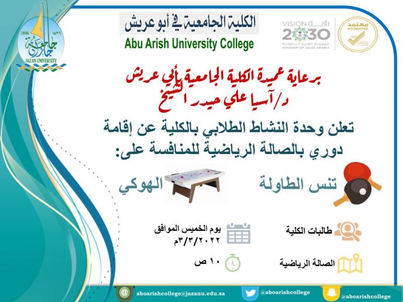 ممثلة في وحدة النشاط الطلابي الدوري في ألعاب الصالة الترفيهية في (تنس الطاولة والهوكي)