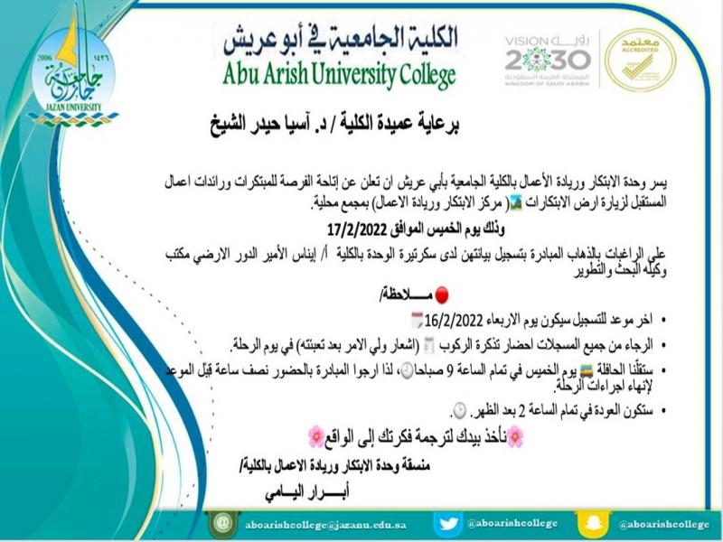 قامت وحدة الابتكار وريادة الاعمال بالكلية الجامعية بأبي عريش برفقة مجموعة من طالبات الكلية يوم الخميس الموافق 17-2-2022 بزيارة مركز الابتكار وريادة الأعمال بجامعة جازان بإشراف منسقة الوحدة أ.ابرار اليامي