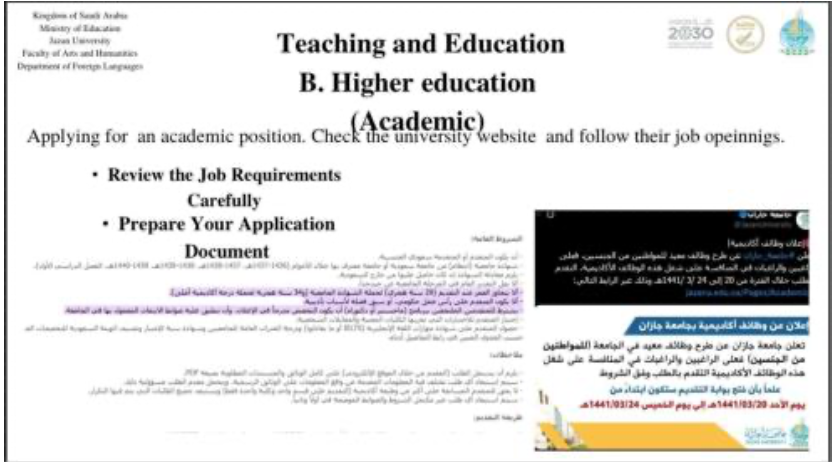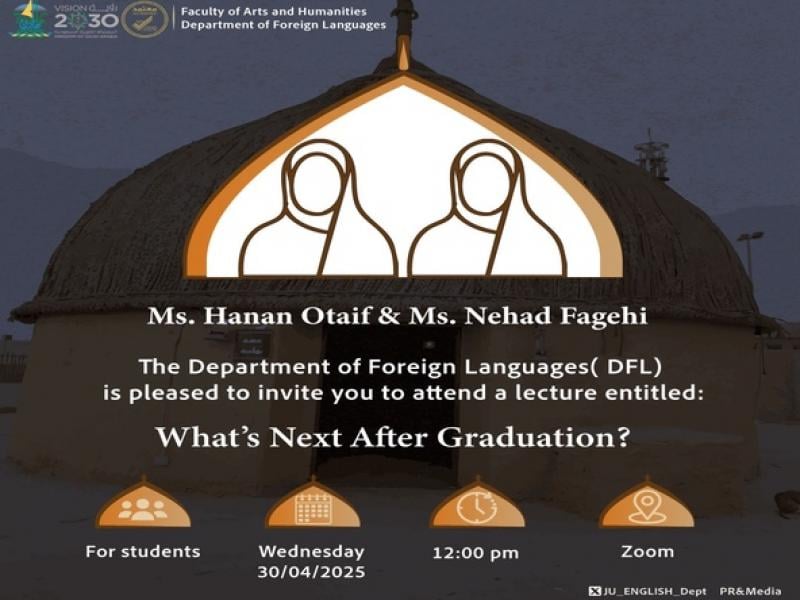 The Department of Foreign Languages (DFL) in collaboration with the PR & Media Committee, organized a workshop for students entitled “What’s Next after Graduation?” The workshop was conducted by Ms. Hanan Otaif and Ms. Nehad Fagehi on Wednesday, April 30, 2025 at 12:00 pm via the Zoom platform. The session aimed to guide graduating students on potential career paths, further education opportunities, and practical steps to take after completing their studies.