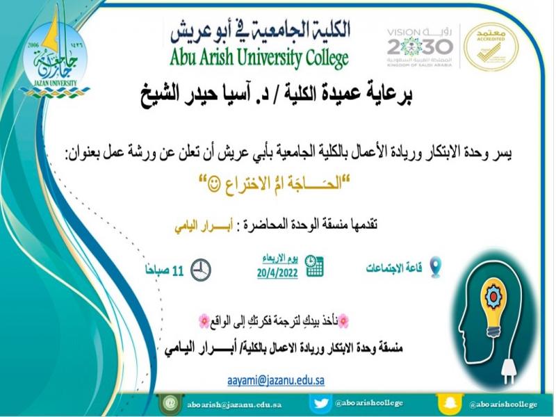 نظمت وحدة الابتكار وريادة الأعمال اليوم الخميس الموافق 21/4/2022 ورشة عمل بعنوان (الحاجة أم الاختراع) بالتزامن مع اليوم العالمي للابتكار وريادة الأعمال، والتي قدمتها منسقة الوحدة م. أبرار اليامي بقاعة الاجتماعات بالكلية.